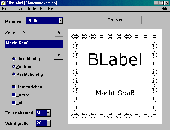 | BlitzLabel ist ein Programm zum Drucken von Etiketten und Ähnlichem. Es läßt sich an alle Etikettenbögen anpassen. BlitzLabel ist schnörkellos und einfach, man kommt sehr schnell zu Ergebnissen! ![]() |